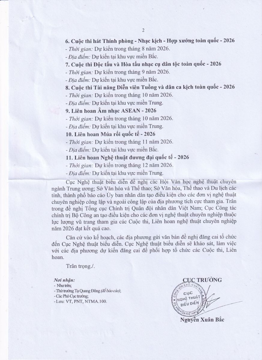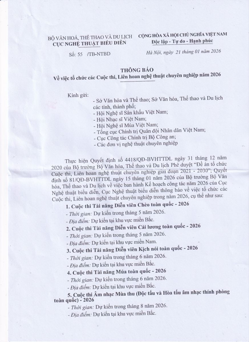 Thực hiện Quyết định số 4418/QĐ-BVHTTDL ngày 31/12/2020 và Quyết định số 81/QĐ-BVHTTDL ngày 15/01/2026 của Bộ trưởng Bộ Văn hóa, Thể thao và Du lịch, Cục Nghệ thuật biểu diễn thông báo về việc tổ chức các Cuộc thi, Liên hoan nghệ thuật chuyên nghiệp trong năm 2026, cụ thể như sau: