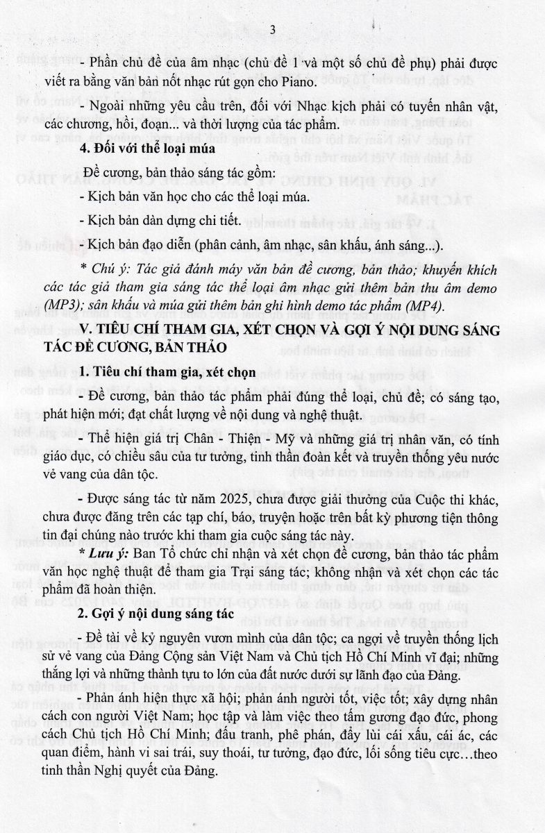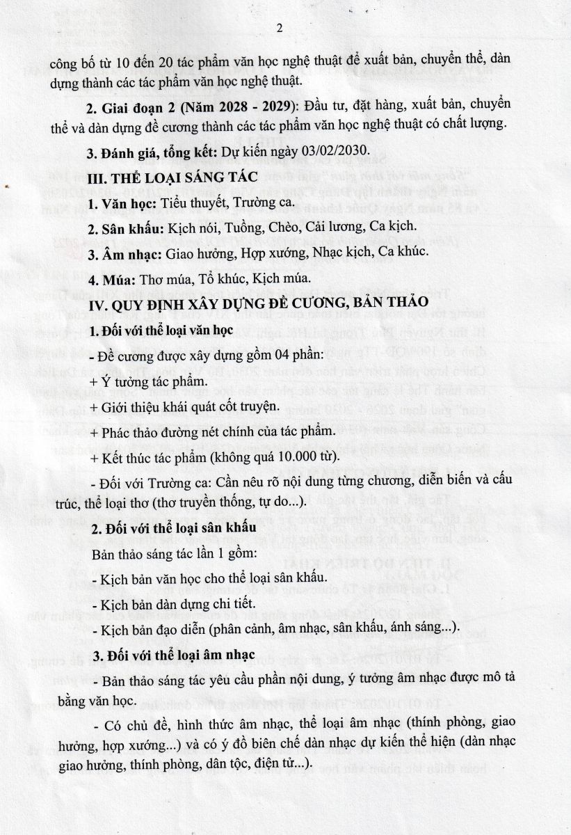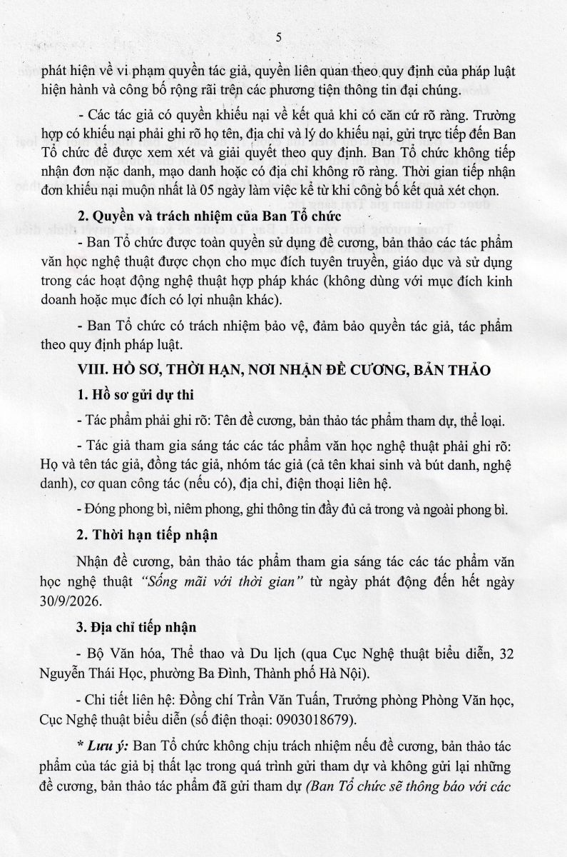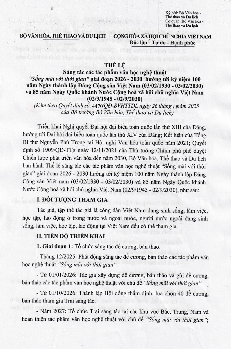 Thực hiện Quyết định số 4437/QĐ-BVHTTDL ngày 24/11/2025 của Bộ trưởng Bộ Văn hóa, Thể thao và Du lịch về việc tổ chức phát động sáng tác tác phẩm văn học nghệ thuật "Sống mãi với thời gian" giai đoạn 2026 - 2030 hướng tới kỷ niệm 100 năm Ngày thành lập Đảng Cộng sản Việt Nam (03/2/1930 - 03/2/2030) và 85 năm Ngày Quốc khánh nước Cộng Hòa Xã Hội Chủ Nghĩa Việt Nam (02/9/1945 - 02/9/2030), Cục Nghệ thuật biểu diễn phối hợp với các đơn vị liên quan tổ chức phát động sáng tác tác phẩm văn học nghệ thuật "Sống mãi với thời gian" giai đoạn 2026 - 2030 với thông báo và thể lệ như sau: