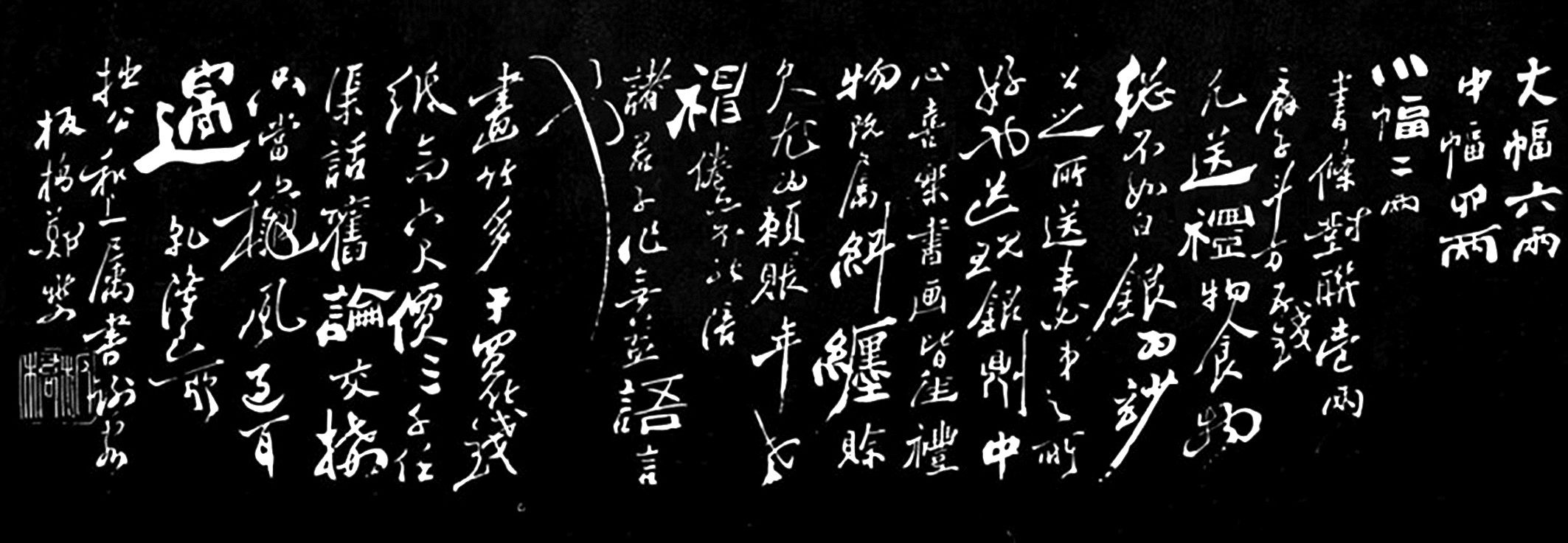 Trong Dương Châu Bát Quái truyện (NXB Thượng Hải Nhân Dân, 1995) có in một bức thư pháp của Trịnh Bản Kiều (1693-1765), nội dung rất độc đáo. Đó là tờ ghi bảng giá mà họ Trịnh công cáo, toàn văn dịch như sau: "Tranh lớn 6 lượng [bạc], tranh vừa 4 lượng, tranh nhỏ 2 lượng; thư pháp cuộn, câu đối 1 lượng; quạt, tranh vuông nhỏ 5 tiền. Như đưa quà cáp, thực phẩm thì không hay như tiền bạc, bởi quà cáp các vị đưa chưa chắc là thứ tôi thích. Đưa tiền mặt thì trong lòng vui vẻ, chữ và tranh đều đẹp. Còn lễ vật chỉ thêm phiền phức, rồi như lấy tranh mà thiếu lại càng dễ quên. Tuổi già sức yếu, cũng không thể tiếp các vị nói chuyện nhảm. Họa trúc đa ư mãi trúc tiền, Chỉ cao lục xích giá tam thiên. Nhậm cừ thoại cựu luận giao tiếp, Chỉ đương thu phong quá nhĩ biên. Càn Long kỷ mão (1759). Chuyết Công hòa thượng chúc thư tạ khách. Bản Kiều Trịnh Nhiếp".