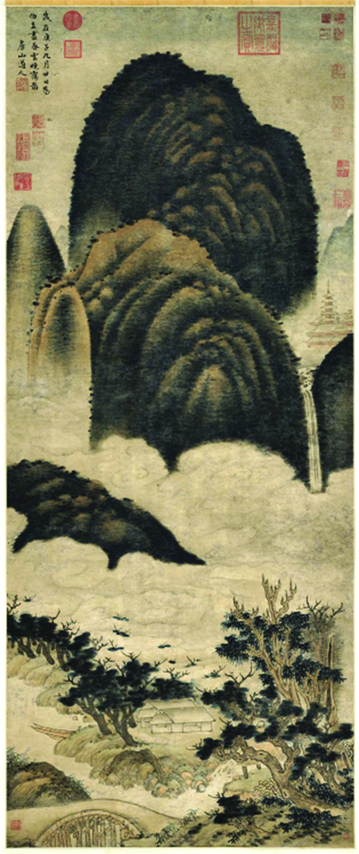 “Xuân vân hiểu ái đồ”, Cao Khắc Cung (1248-1310), người Hồi Hộc (Duy Ngô Nhĩ), quan đến Hình bộ Thượng thư, hiện “Xuân vân hiểu ái đồ” (高克恭春雲曉靄圖) đang thuộc Bảo tàng Cố cung Bắc Kinh, trên tranh ghi là vẽ năm Canh tý (1360), kích thước 139,5x 58 cm, dấu hoàng gia sớm nhất thấy đời Gia Khánh, tức là sau vụ bán 2 tranh nhái (1824) thì có lẽ bức tranh gốc nhập cung