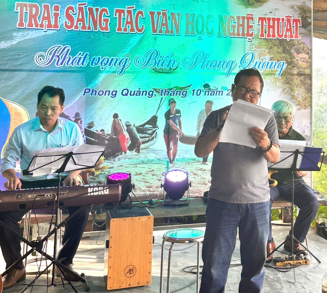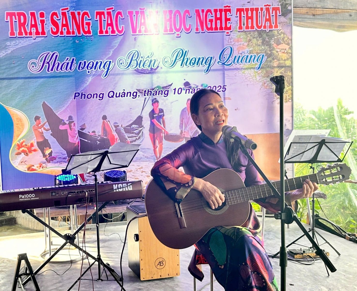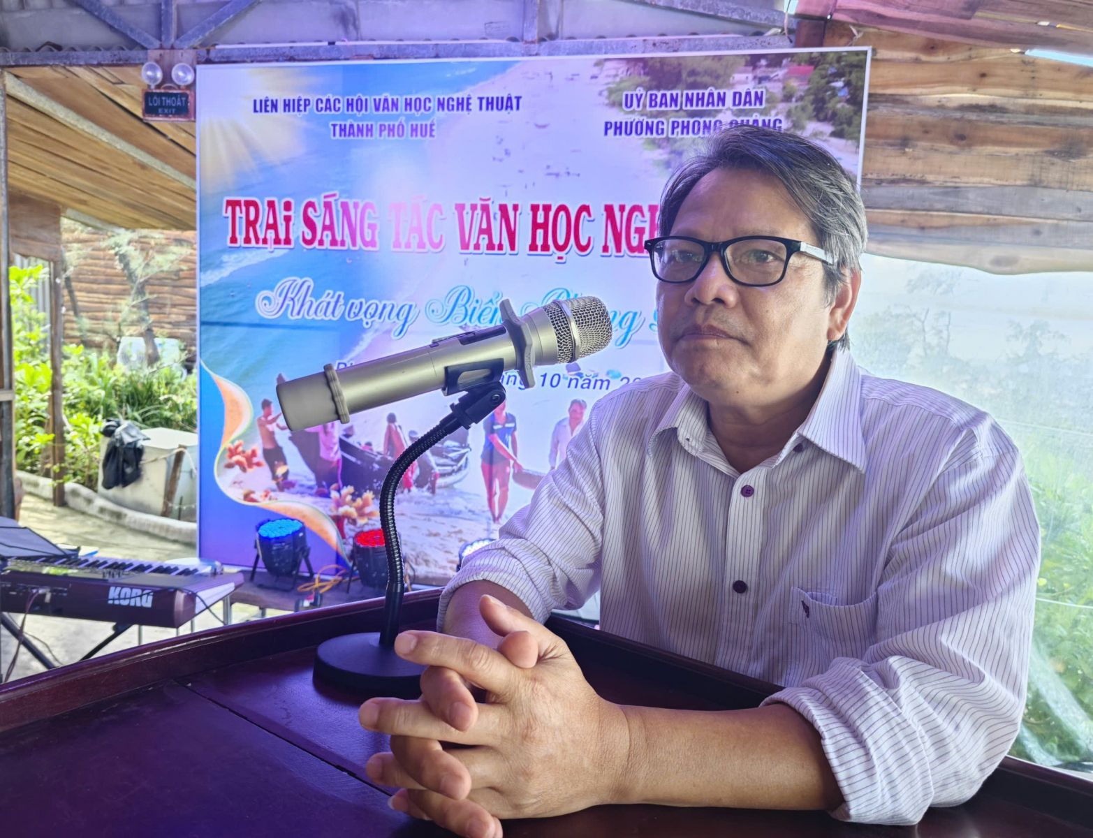 Báo cáo tại buổi bế mạc trại, nhà thơ Lê Đức Thành - Trại trưởng trại sáng tác cho biết, trại sáng tác VHNT "Khát vọng biển Phong Quảng" năm 2025 diễn ra từ ngày 08/10 đến ngày 17/10/2025, dành cho 14 văn nghệ sĩ thuộc 05 hội chuyên ngành: Nhà văn, Âm nhạc, Nhiếp ảnh, Mỹ thuật và Văn nghệ dân gian. Chỉ trong 10 ngày ngắn ngủi, các văn nghệ sĩ đã rong ruổi trên khắp các nẻo đường của Phong Quảng, chìm đắm trong màu biển xanh hoang sơ và cát trắng, với những cơn mưa chiều mùa biển động để cho ra đời những tác phẩm văn học nghệ thuật mang đậm dấu ấn của "Khát vọng biển Phong Quảng".