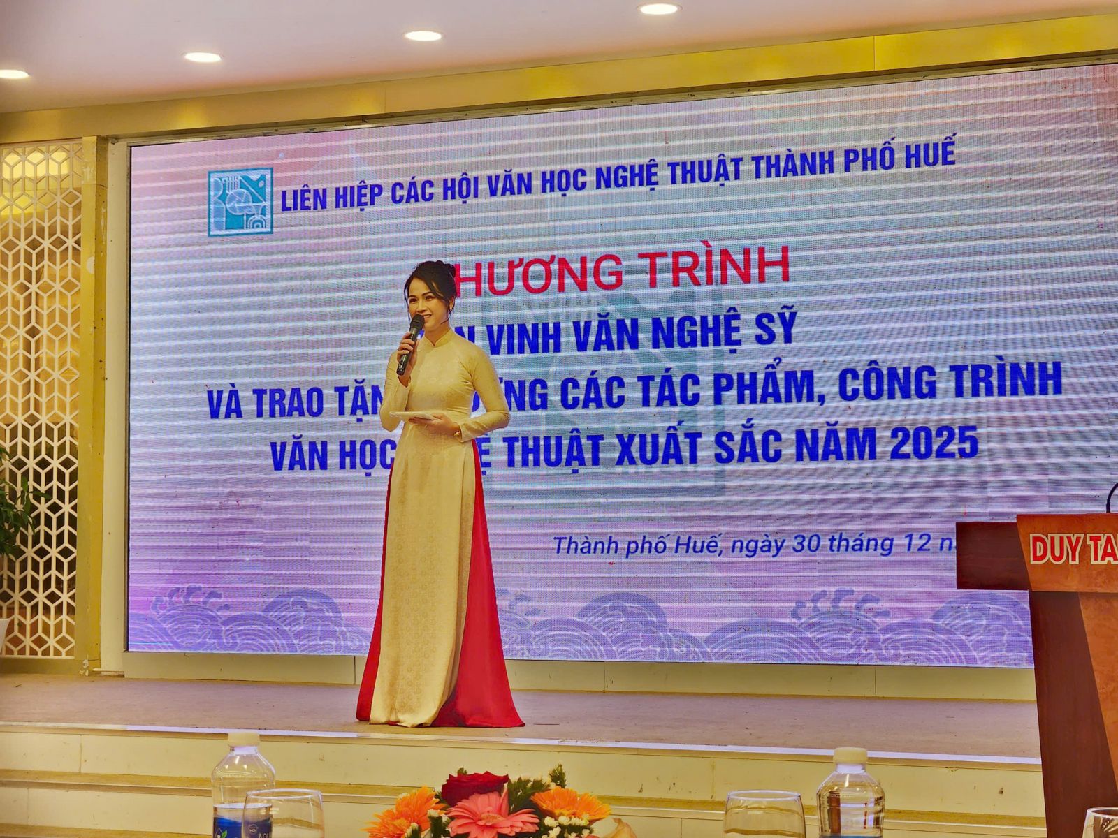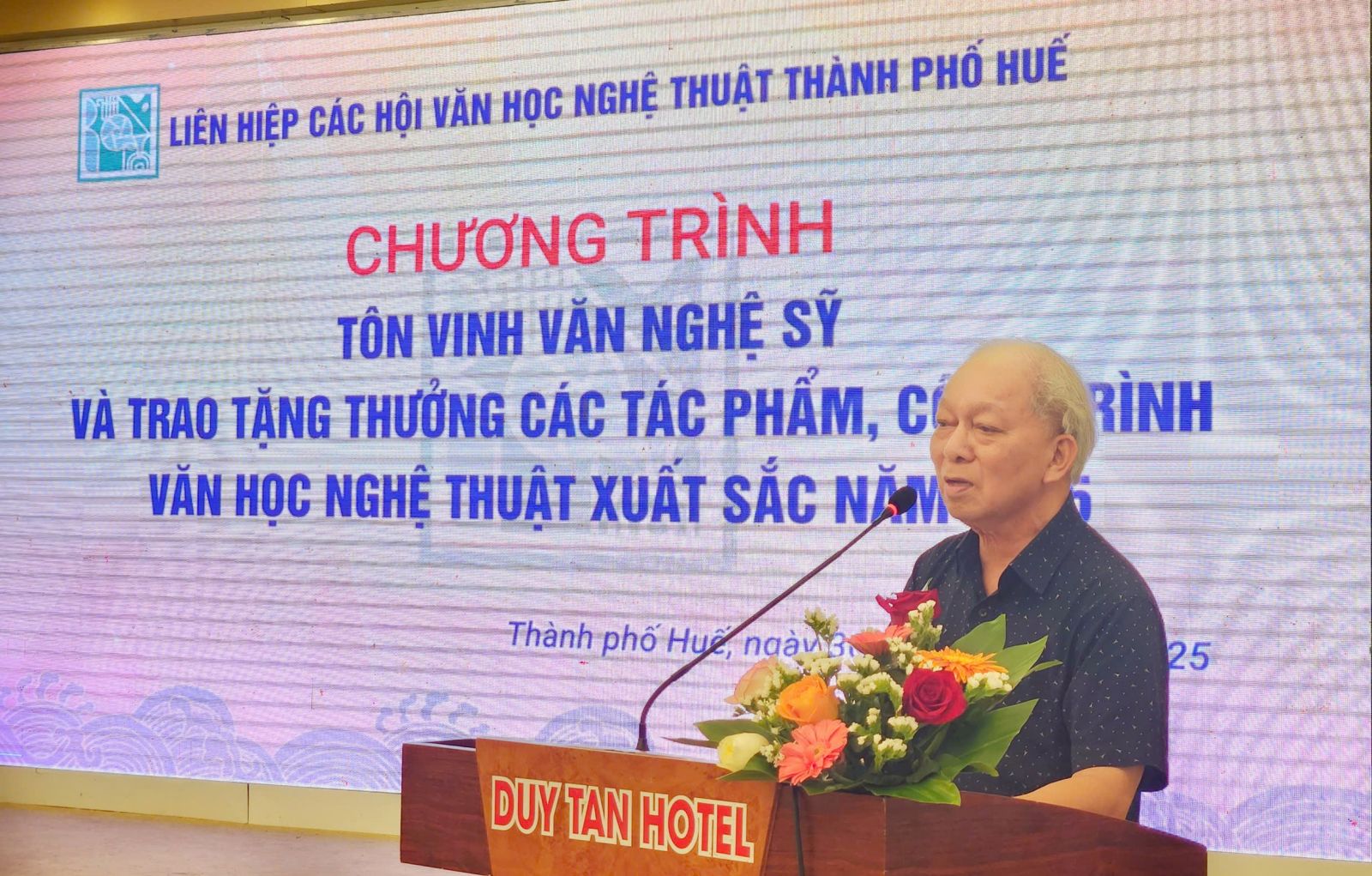Chiều 30/12, Liên hiệp các Hội Văn học Nghệ thuật Thành Phố Huế đã tổ chức chương trình tôn vinh văn nghệ sĩ đã đạt các giải thưởng quốc tế, trong nước, khu vực, giải thưởng hàng năm của Liên hiệp các Hội VHNT Việt Nam, các giải thưởng uy tín khác của quốc gia và trao tặng thưởng các tác phẩm, công trình văn học nghệ thuật xuất sắc năm 2025.