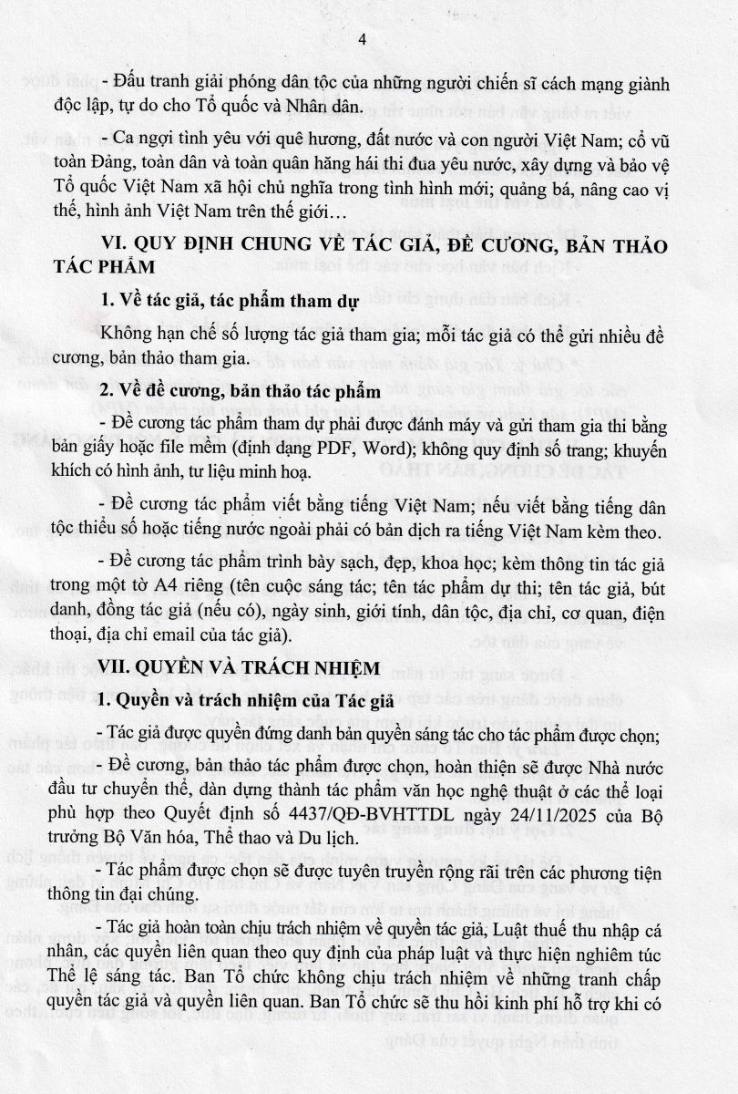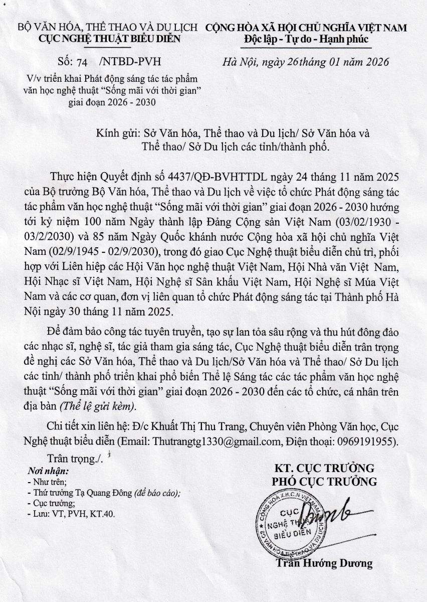 Thực hiện Quyết định số 4437/QĐ-BVHTTDL ngày 24/11/2025 của Bộ trưởng Bộ Văn hóa, Thể thao và Du lịch về việc tổ chức phát động sáng tác tác phẩm văn học nghệ thuật "Sống mãi với thời gian" giai đoạn 2026 - 2030 hướng tới kỷ niệm 100 năm Ngày thành lập Đảng Cộng sản Việt Nam (03/2/1930 - 03/2/2030) và 85 năm Ngày Quốc khánh nước Cộng Hòa Xã Hội Chủ Nghĩa Việt Nam (02/9/1945 - 02/9/2030), Cục Nghệ thuật biểu diễn phối hợp với các đơn vị liên quan tổ chức phát động sáng tác tác phẩm văn học nghệ thuật "Sống mãi với thời gian" giai đoạn 2026 - 2030 với thông báo và thể lệ như sau: