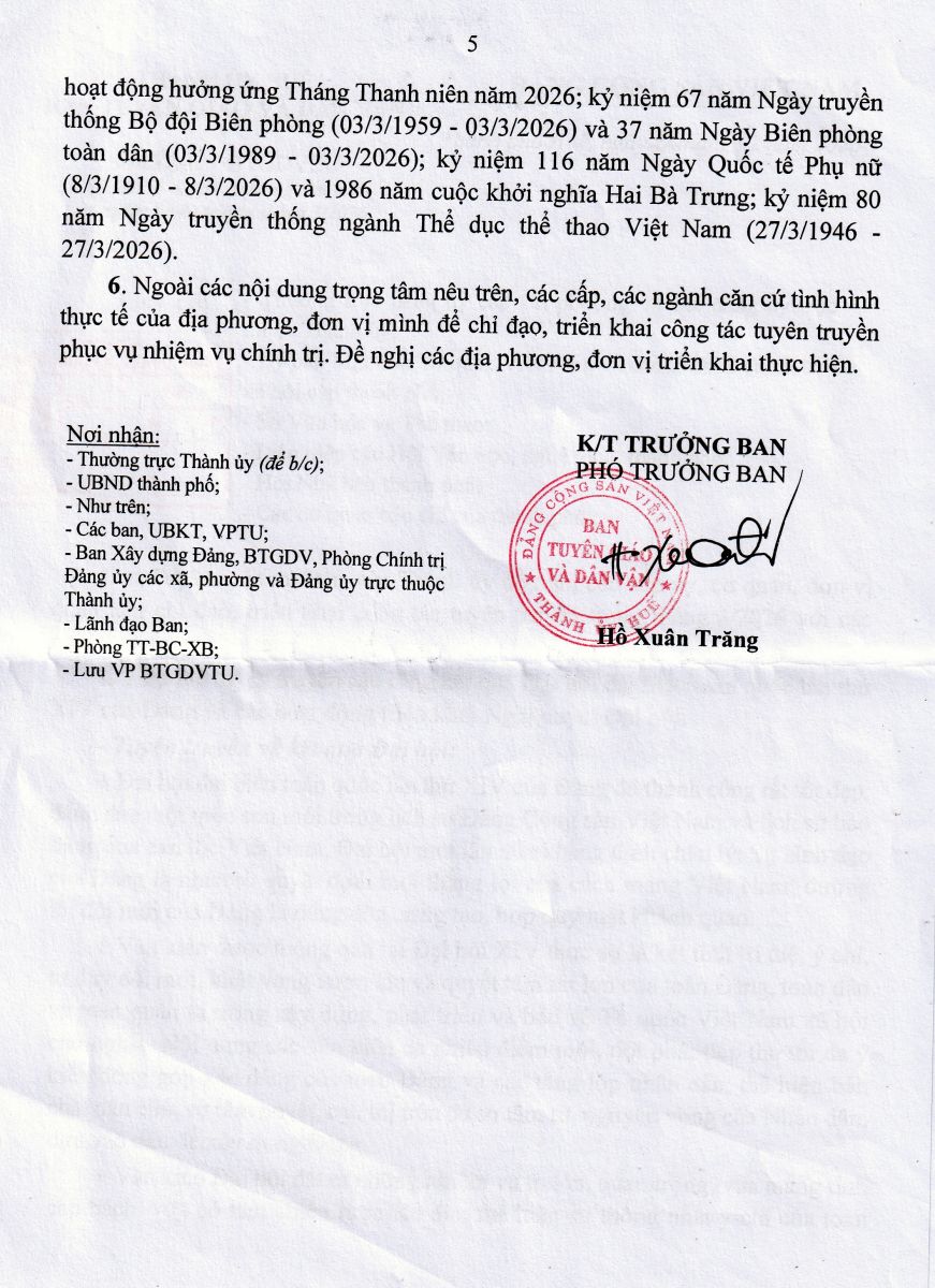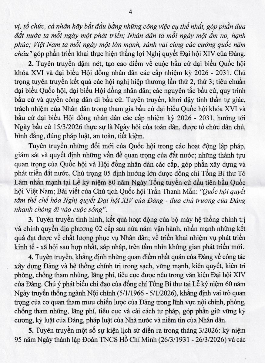 Ban Tuyên giáo và Dân vận Thành ủy đề nghị các cấp ủy, cơ quan, đơn vị quan tâm chỉ đạo, triển khai công tác tuyên truyền trong tháng 3/2026 với các nhiệm vụ trọng tâm như sau.