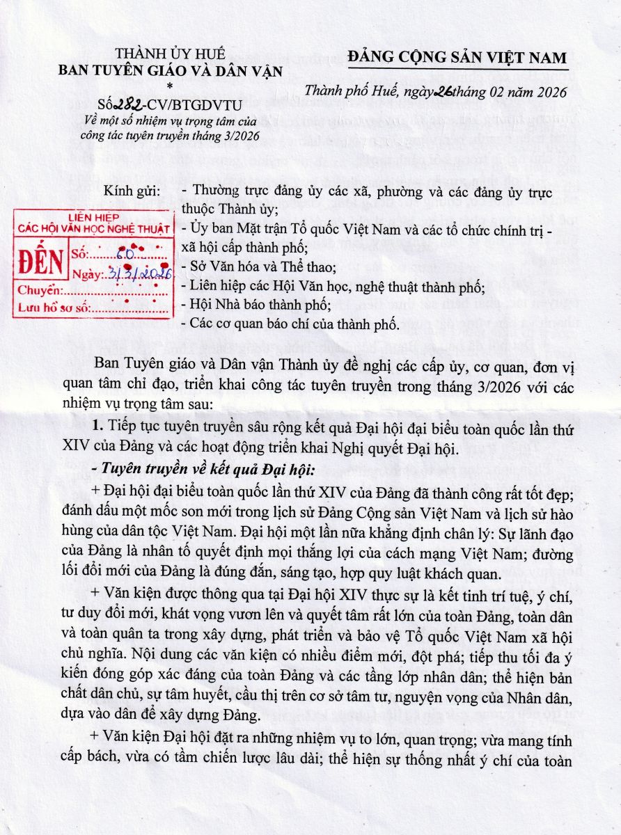 Thông báo Về một số nhiệm vụ trọng tâm của công tác tuyên truyền tháng 03/2026