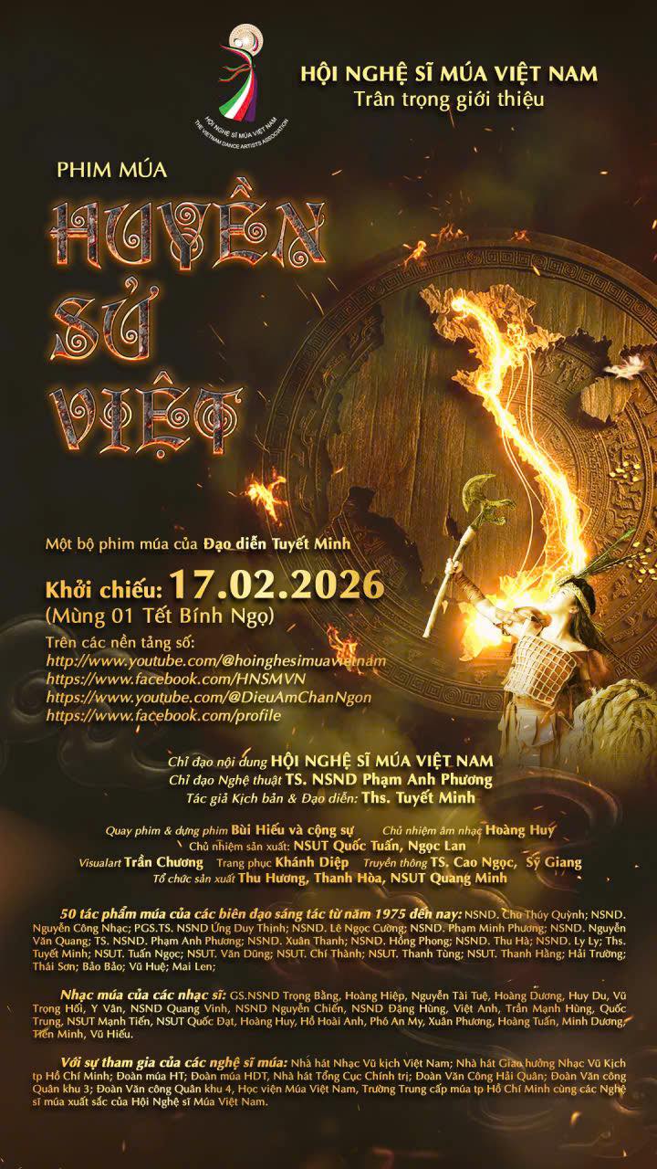 Phim múa "Huyền Sử Việt" sẽ chính thức khởi chiếu vào Mùng 1 Tết Bính Ngọ (17-2-2026) trên các nền tảng số của Hội Nghệ sĩ Múa Việt Nam và đối tác.